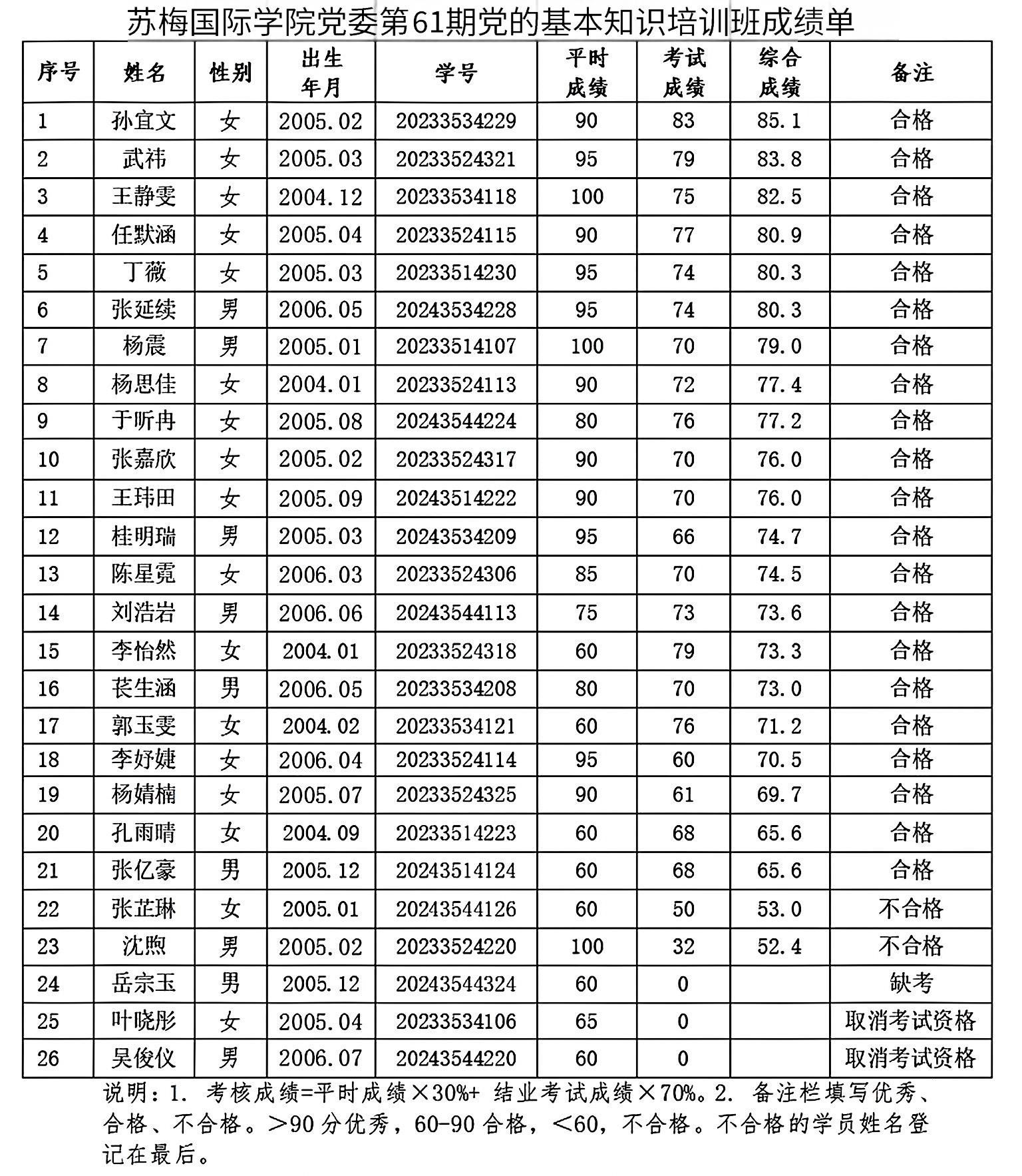 苏梅国际学院党委第 61 期党的基本知识培训班成绩公示