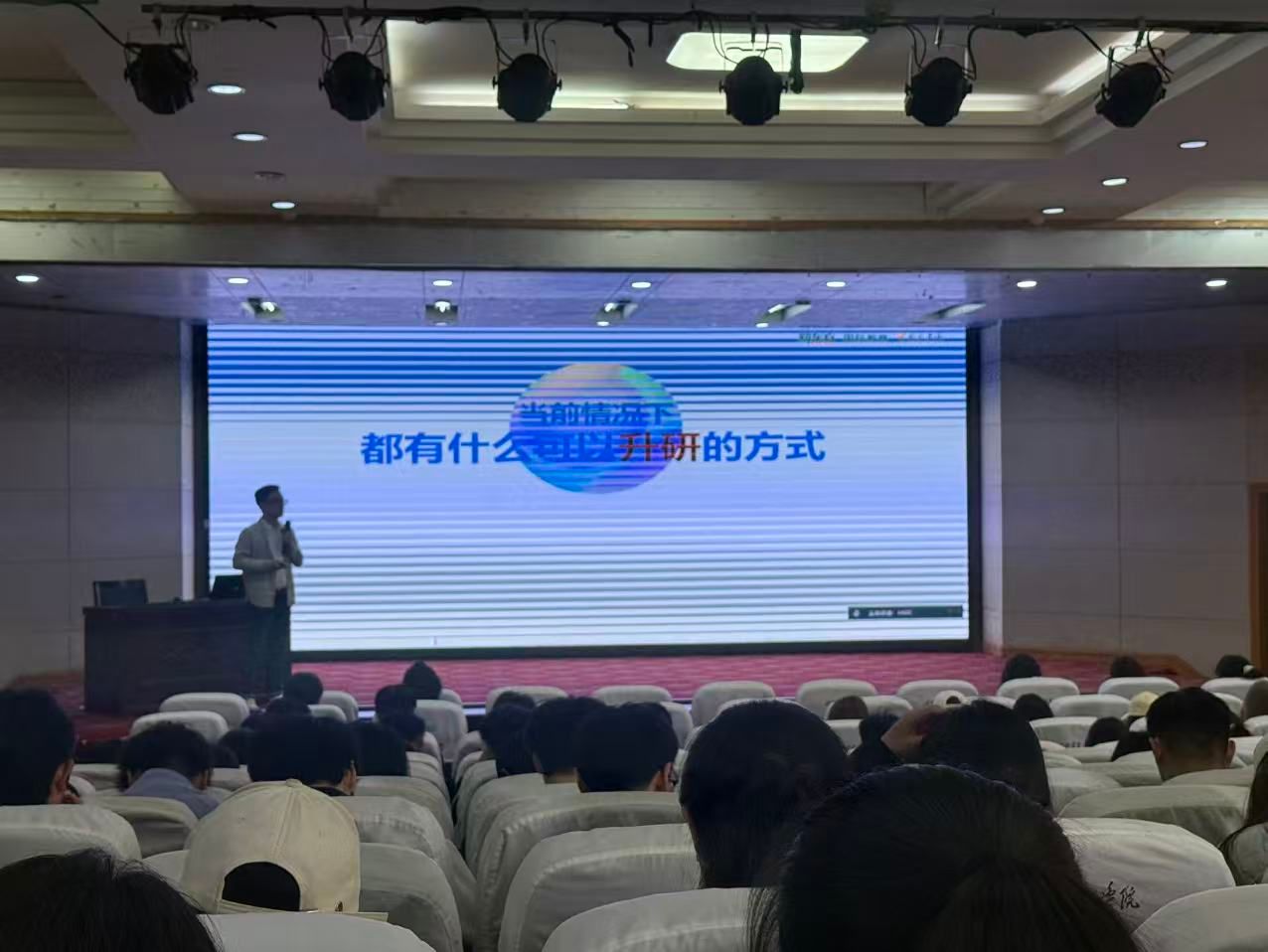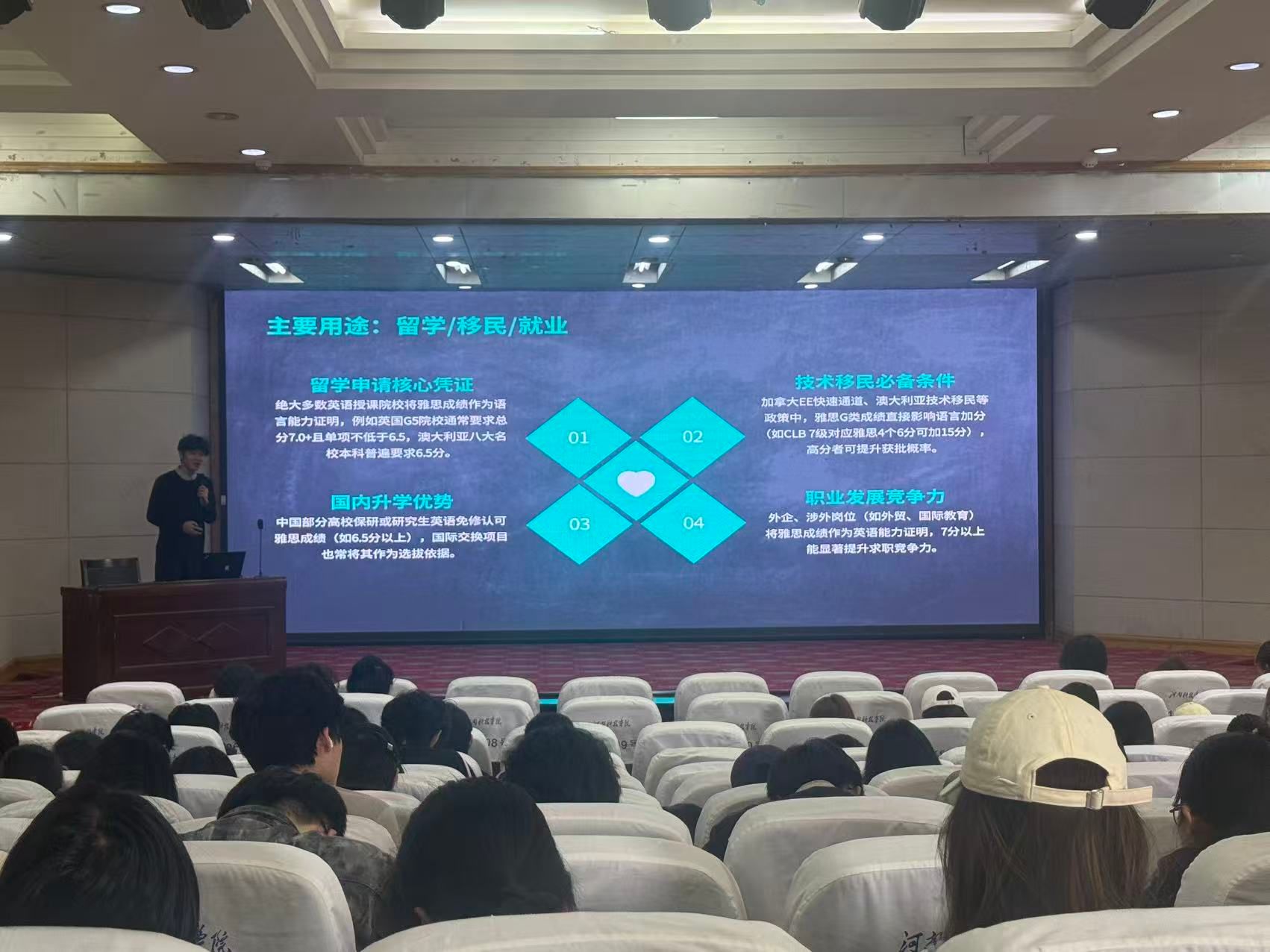 讲座中,刘鹏辉老师围绕国内考研、海外申硕、中外合作办学等多元升学路径展开全面解读,清晰梳理不同路径的申请要求、时间规划与核心准备要点。同时,他结合当前留学申请、技术移民、外企就业等实际需求,详细讲解雅思成绩在升学申请、语言加分、职业竞争力提升等方面的重要作用,为学生提供实用参考。
