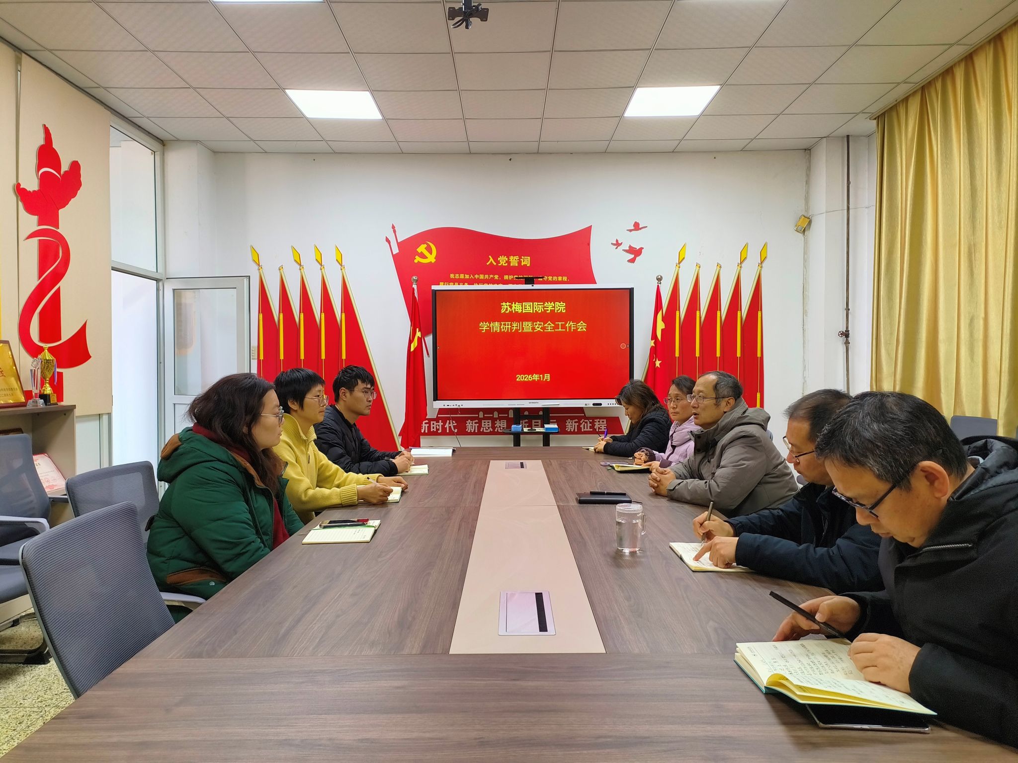 为全面加强期末学生安全稳定工作,切实保障师生身心健康与校园和谐有序,1月8日上午,苏梅国际学院在博闻楼501党建活动室召开学情研判暨安全工作会议。学院党委书记张平、院长吴艳兵,党委副书记刘凤,副院长沈军、王君君,团委书记张宁宁、辅导员崔嘉欣和胡俊杰等参会。
