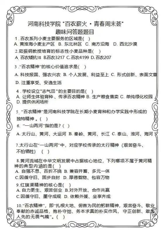 据统计,本次活动累计吸引全校300余名师生及周边社区居民参与,发放问答奖品200余份。活动虽已落幕,但“一山两河”的故事仍在继续,让我们继续用心灵传承文脉,用脚步丈量山河,将“百农精神”转化为实际行动,让红色基因真正融入血脉,为学校高质量发展贡献力量。